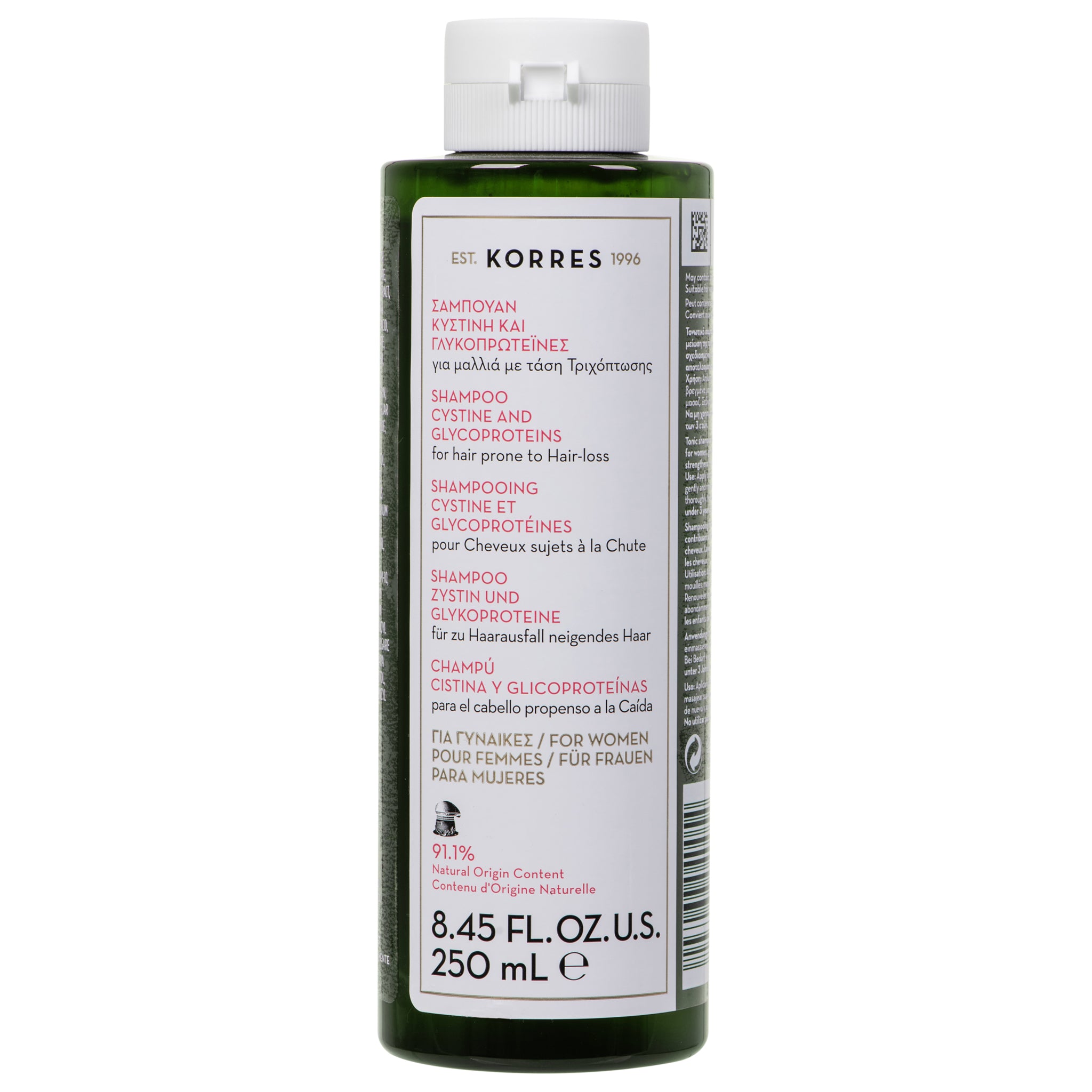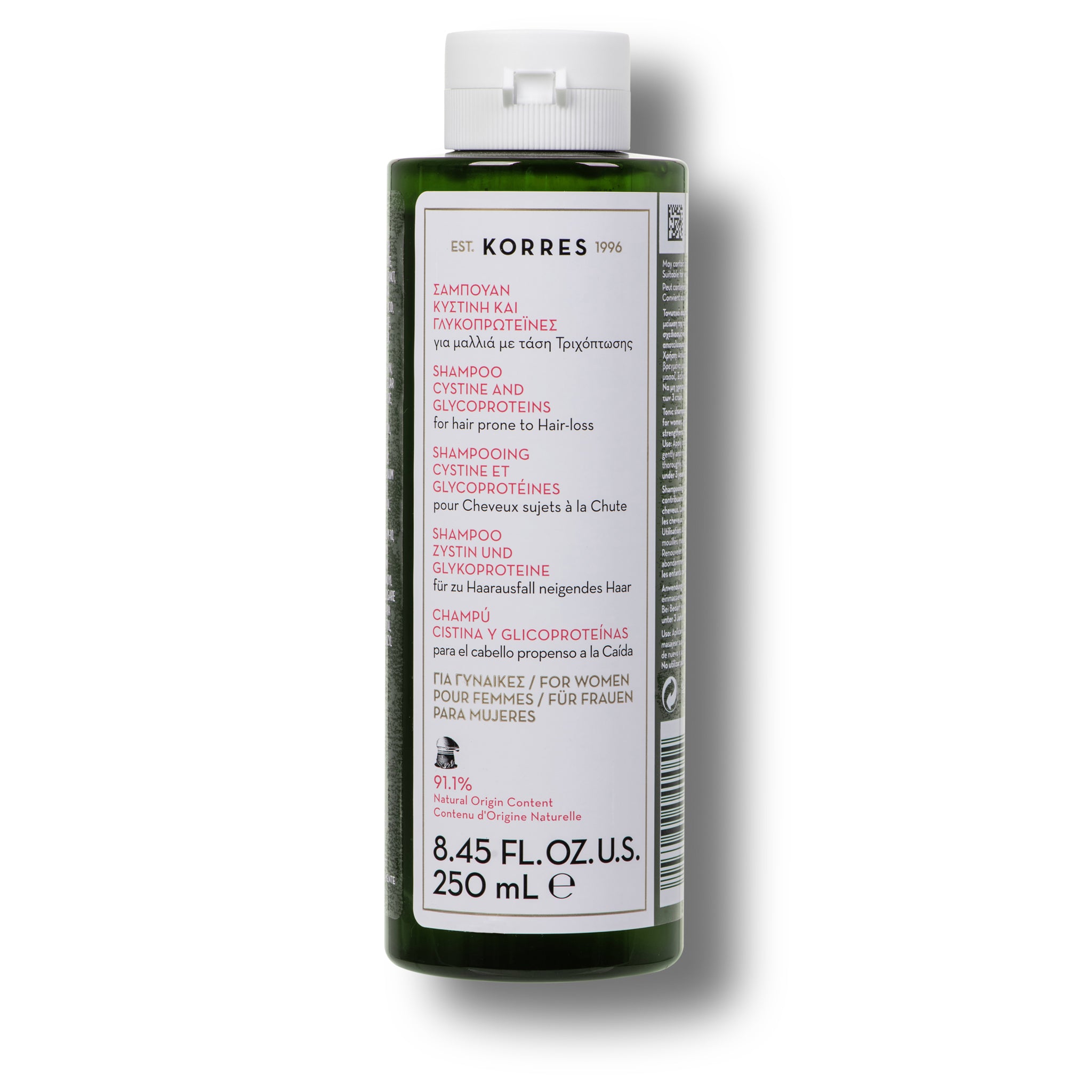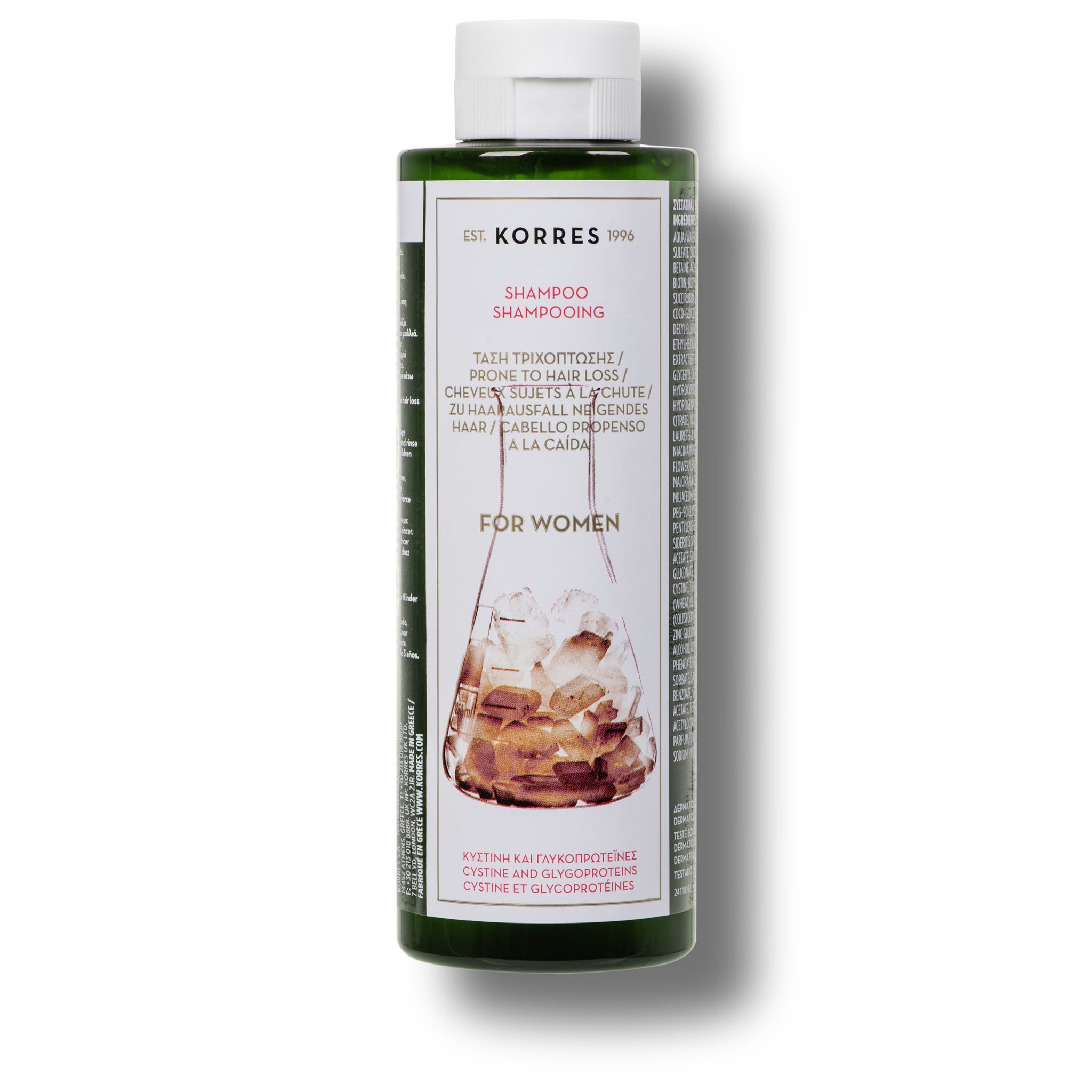 De Korres Cystine & Glycoproteins Anti-Hair Loss Shampoo for Women combineert cystine met verzorgende glycoproteïnen om de haarwortels te versterken en haaruitval effectief tegen te gaan. Biotine en niacinamide voeden de haarvezel en ondersteunen de vitaliteit van het haar, terwijl panthenol zorgt voor hydratatie en veerkracht. Extracten van duizendblad, kinabast en gierst stimuleren de doorbloeding van de hoofdhuid en verbeteren de verankering van het haar. Het resultaat: sterker, voller en veerkrachtiger haar dat zijn natuurlijke glans terugkrijgt – ontwikkeld om dunner wordend vrouwenhaar nieuw leven in te blazen.