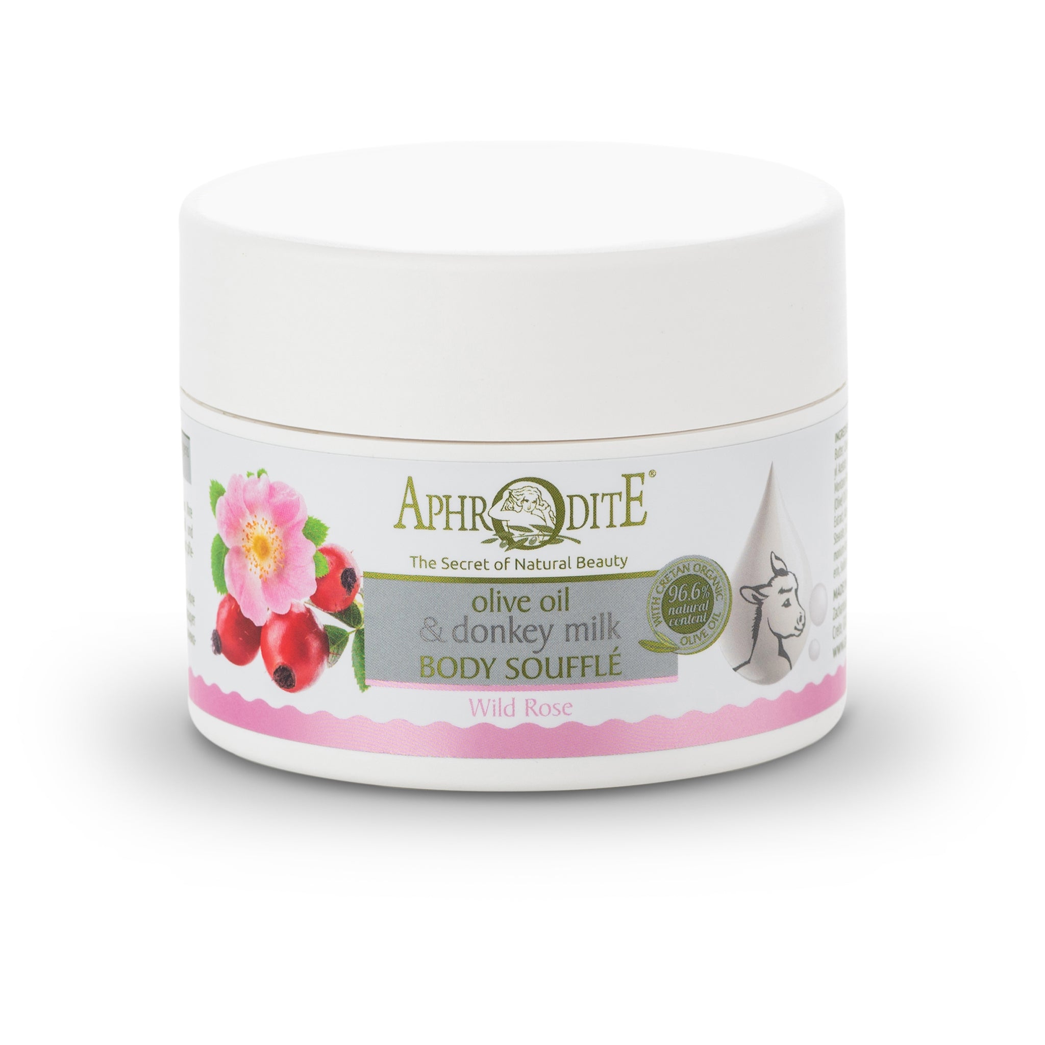 Met de zachtheid van een romig geklopte mousse en de luchtigheid van een soufflé krijg je met deze moisturizer wel een heel bijzondere wellness-beleving. De natuurlijke body soufflé met ezelinnenmelk en wilde roos van Aphrodite natuurlijke cosmetica geniet je namelijk van perfecte, zijdezachte hydratatie in een zeer prettige textuur. De lobbige soufflé smeert zo fijn uit dat het smelt in de huid en direct zorgt voor een ademende hydratatie en satijnzachte souplesse. Dankzij de vele natuurlijke plantextracten hét product voor de droge, poreuze en gevoelige huid.