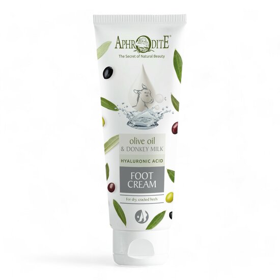 Ezelinnenmelk en olijfolie bevatten een schat aan vitaminen en omega-vetzuren. Dit gecombineerd met shea butter maakt de natuurlijke voetencrème van Aphrodite natuurlijke cosmetica een effectieve behandeling tegen een ruwe, gebarsten huid, eelt en droge voetzolen. De ezelinnenmelk wordt vervaardigd door ezelinnen die voornamelijk zijn opgevangen en worden verzorgd op ezelinnenboerderijen in Griekenland en op Cyprus. De vitaminen en antioxidanten uit de plantaardige extracten zorgen voor extra verzorging, voeding en hydratatie. Voor fantastisch zachte, stralende en rijk gehydrateerde voeten. Zelfs geschikt voor de meest gevoelige huid en de huid die last heeft van symptomen van eczeem en psoriasis.