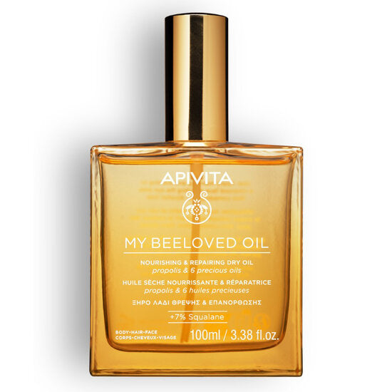 De My Beeloved Nourishing & Repairing Dry Oil van Apivita is een 100% natuurlijke multifunctionele olie voor iedereen die van een sensuele, lichte verzorging houdt. De droge textuur trekt direct in, omhult je huid en haar met een subtiele geur en geeft een zachte glans zonder te plakken. Deze olie is perfect voor elk seizoen: als voedende boost op droge benen in de zomer, als herstellende haarolie na het wassen of als glansaccent op je schouders of jukbeenderen. Een verzorgingsproduct dat je niet alleen ziet, maar ook voelt.