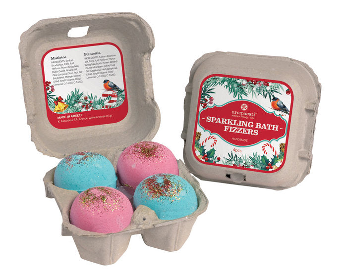Dit kerstsetje met bruisballen bevat vier bruisballen met twee winterse geuren om jouw badkamer om te toveren tot een sfeervol winters tafereel.