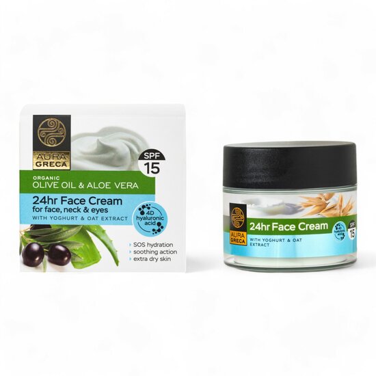 Als je snel last hebt van een droge en gevoelige huid, is hydrateren en kalmeren het belangrijkste. Dat doe je met de natuurlijke gezichtscrème voor de droge huid van Aura Greca. Voedende, herstellende en hydraterende ingrediënten verwennen de huid, terwijl de vochtbalans wordt gestabiliseerd en de huidbarrière wordt beschermd. De oliën, proteïnen, hyaluronzuur en allantoïne zorgen voor een verbeterde verzorging van de huid. Hierdoor kunnen droogtelijntjes verminderen, krijgt de huid een jeugdige, prachtige glans en verbeter je de vochtbalans. Het unieke 4D Hyaluroncomplex bevat verschillende grootten moleculen, waardoor niet alleen het huidoppervlak, maar ook de dieper gelegen huidlagen worden gehydrateerd en verstevigd.