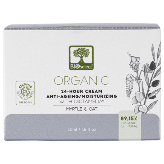 De Bioselect 24-uurs Anti-Aging & Hydraterende Crème is een alles-in-één oplossing voor een gehydrateerde, soepele en jonger uitziende huid. Deze crème combineert de voedende kracht van Dictamelia®, hyaluronzuur en arganolie om de huid intensief te hydrateren en tekenen van veroudering te verminderen. Biologische granaatappel en aloë vera bieden antioxidatieve bescherming en verbeteren de huidstructuur. De lichte, snel absorberende textuur maakt deze crème perfect voor zowel overdag als 's nachts, voor een stralende en stevige huid bij elk gebruik.