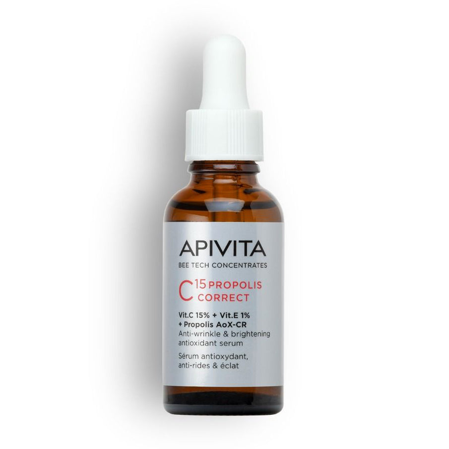 Het C15 Propolis Correct Serum van APIVITA combineert een krachtige dosis vitamine C (15%) met de zuiverende en antioxiderende werking van propolis. Deze formule richt zich op het verminderen van pigmentvlekken, het egaliseren van de teint en het herstellen van de natuurlijke glans van de huid.