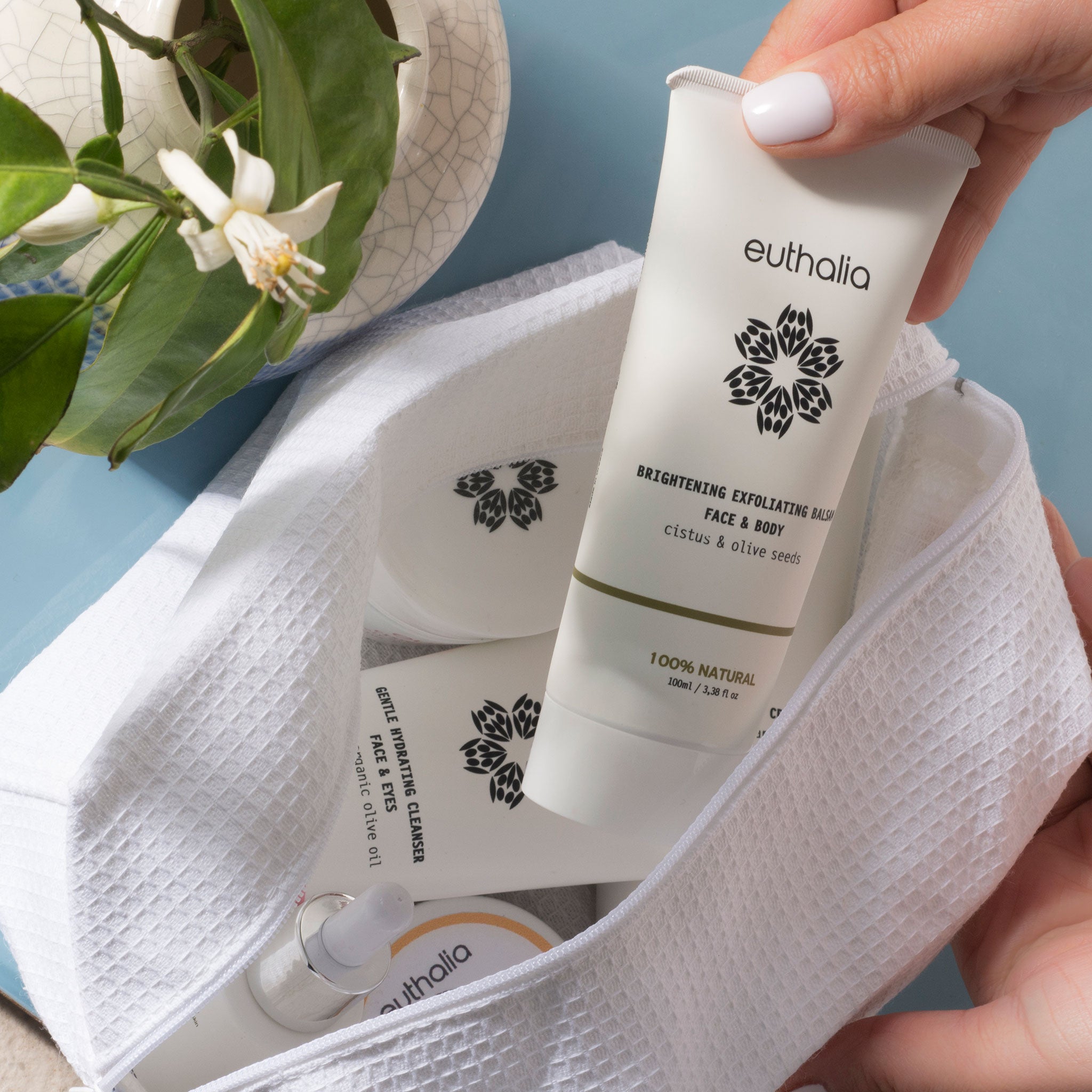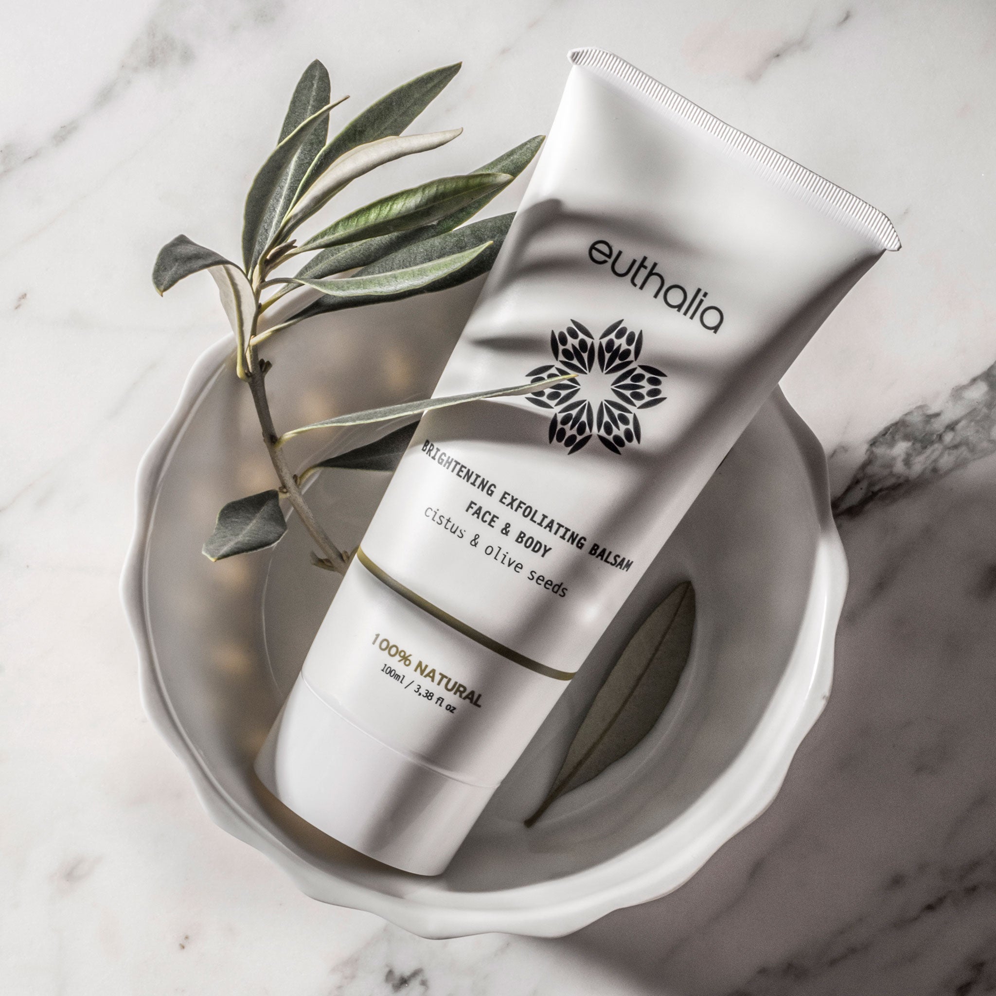 Geniet van een stralend frisse en egale huid met de 100% natuurlijke brightening exfoliërende balsem van Euthalia. De balsem is heerlijk zacht en bevat een actieve blend van olijfolie, -steen en de esentiële olie van cistus ladaniferus. De natuurlijke exfoliant polijst dode huidcellen weg, voor een jeugdige glow en stralende, vitale teint. Heb je last van oneffenheden, een grauwe huidtextuur en een doffe teint? Gebruik dan deze natuurlijke scrub en sta versteld van een tintelfris en satijnzacht resultaat. Geschikt voor elk huidtype; zelfs voor de gevoelige huid, en kan twee tot drie keer per week gebruikt worden.
