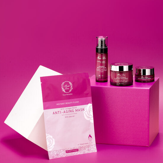 Het Fresh Line Anti-aging Collagen Boost Sheet Mask biedt jouw huid een verjongende verzorging met geavanceerde ingrediënten die zich richten op het verminderen van zichtbare tekenen van veroudering. Dit hoogwaardige Bio-Cellulose masker zit vol met hyaluronzuur, een krachtig ingrediënt dat bekendstaat om zijn intens hydraterende werking. Hyaluronzuur dringt diep door in de huid, vult fijne lijntjes op en geeft de huid een volle, frisse uitstraling. Sophora Japonica-extract, een krachtige antioxidant, helpt daarnaast bij het beschermen van de huid tegen schadelijke invloeden en bevordert de aanmaak van collageen voor een gladdere, stevigere huid.