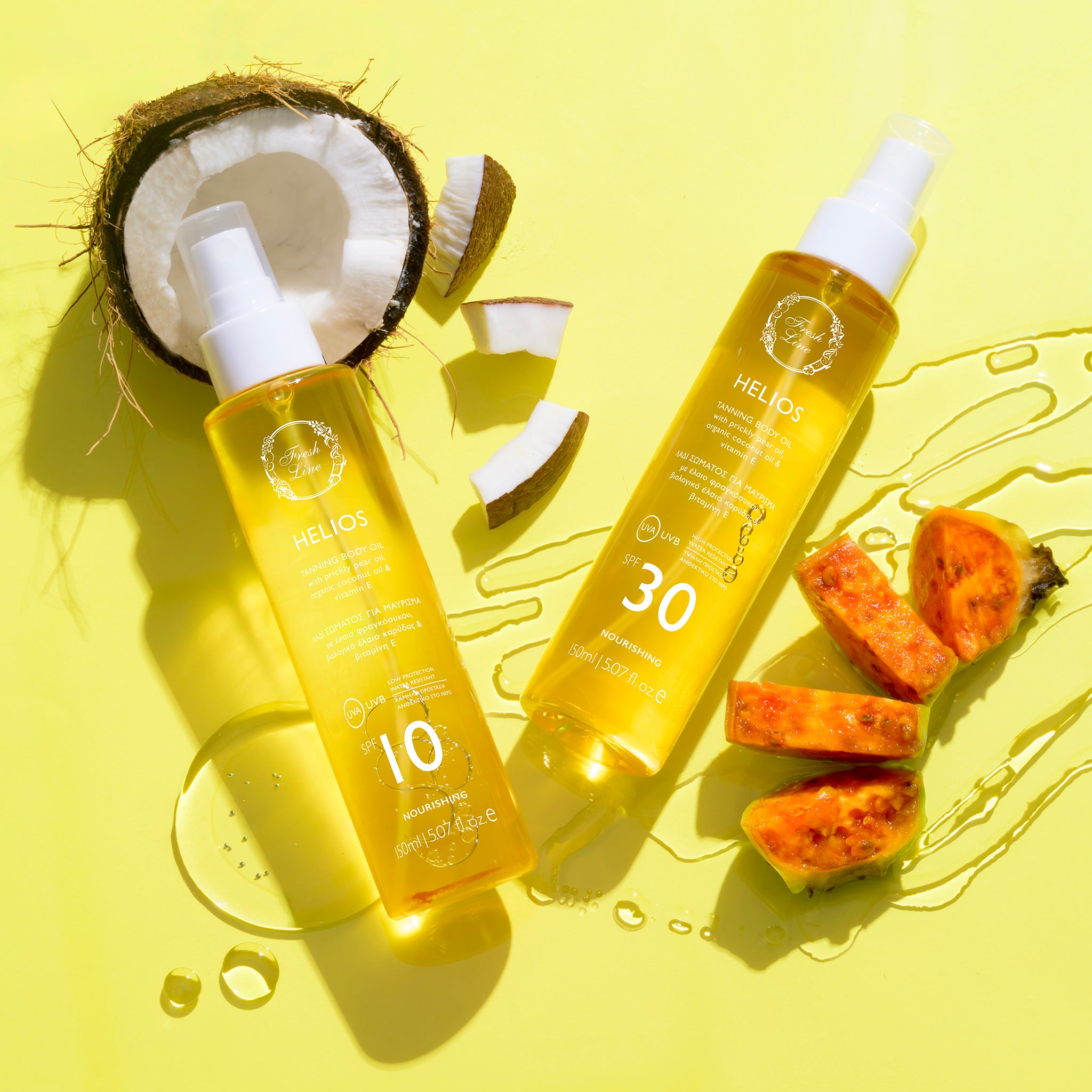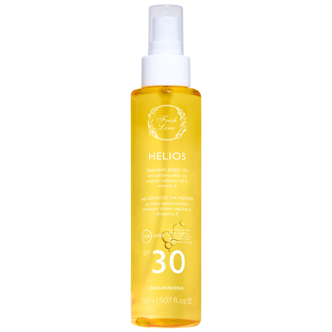 Ervaar de ultieme verzorging en een stralende huid met Fresh Line Helios Tanning Body Oil SPF30.