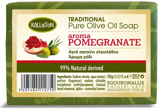 Ontdek de unieke combinatie van koudgeperste olijfolie en de antioxidantrijke granaatappel in de olijfzeep Granaatappel van Kálliston. Deze zeep, op de traditionele manier gemaakt met de puurste olijfolie, belichaamt de rijke traditie en puurheid van Griekse huidverzorging. Zero-waste, zalig voor de huid en gaat maandenlang mee.