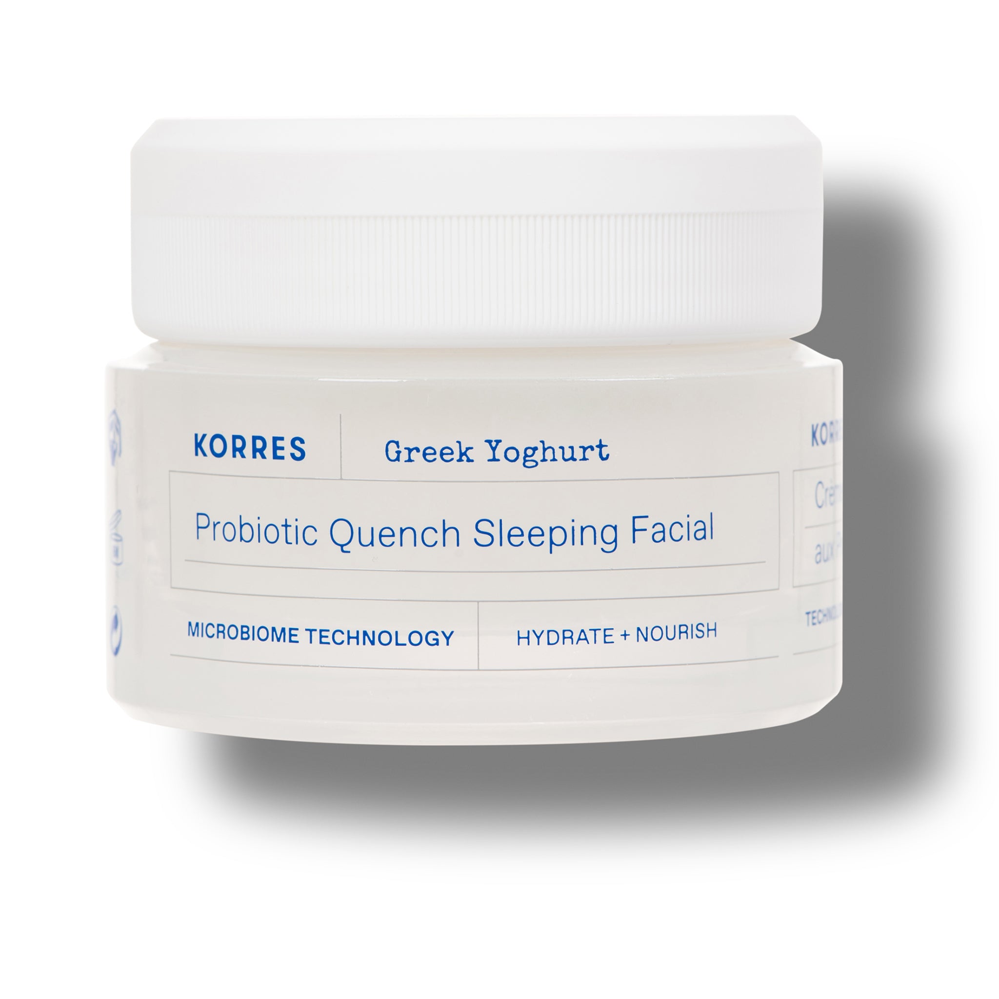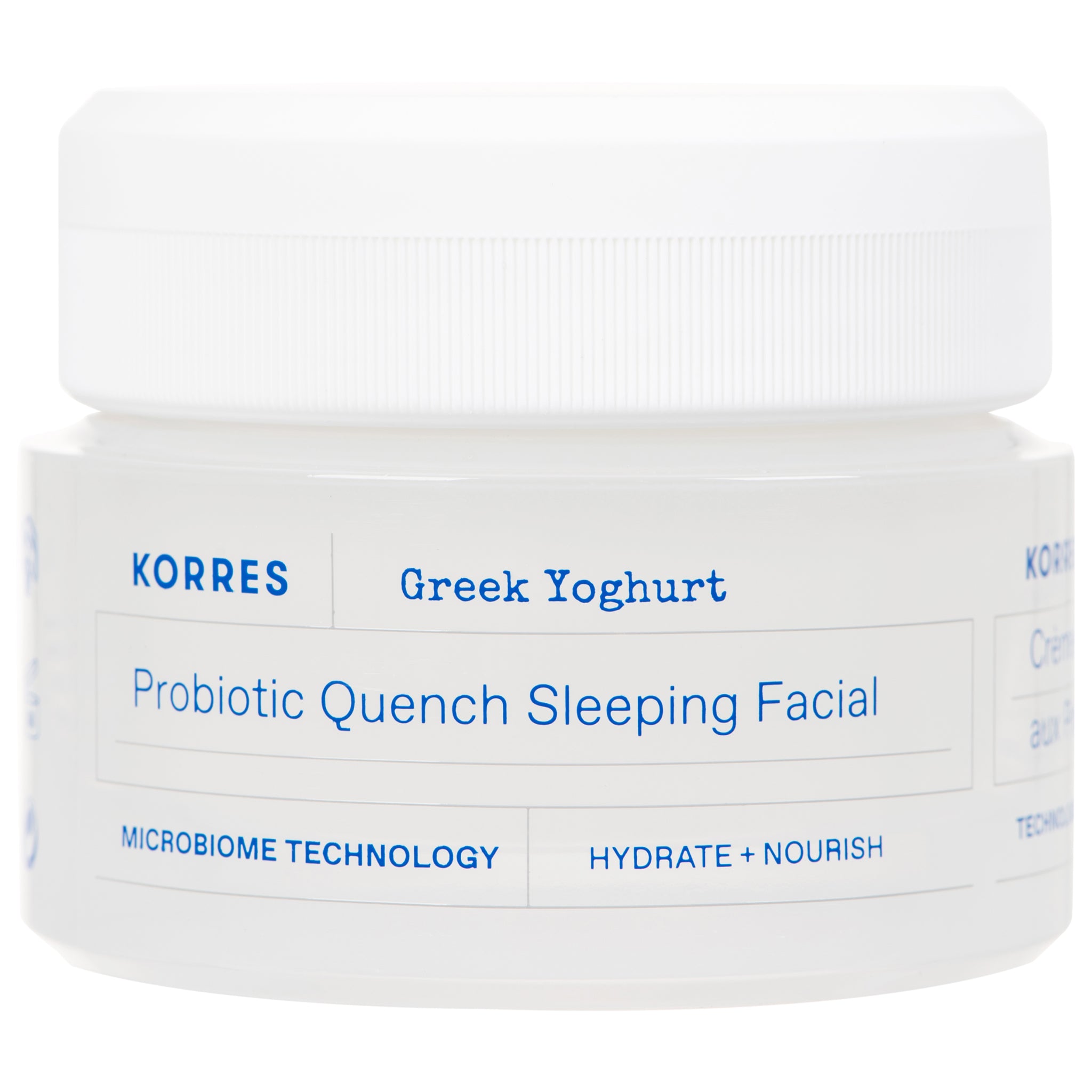 De Greek Yoghurt Probiotic Quench Sleeping Facial van Korres is een voedend nachtmasker dat de huid intens hydrateert en kalmeert terwijl je slaapt. Dankzij de rijke maar luchtige textuur voelt het masker comfortabel aan, zonder zwaar of vettig effect. Bij het ontwaken oogt de huid voller, frisser en zichtbaar uitgerust.