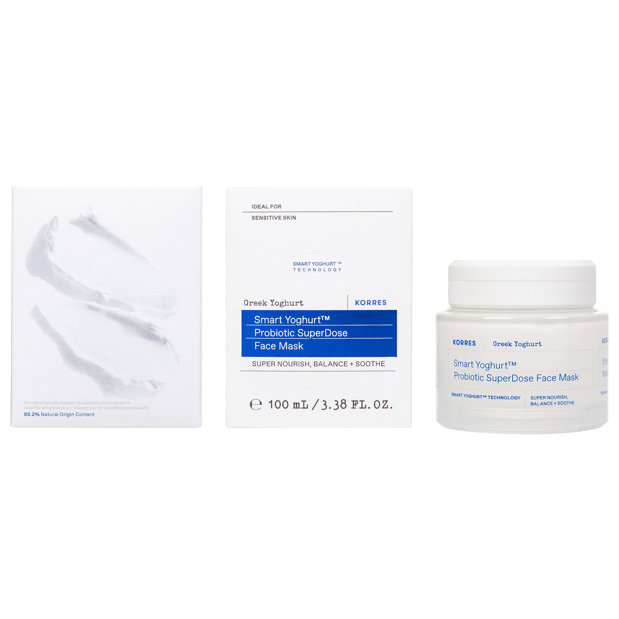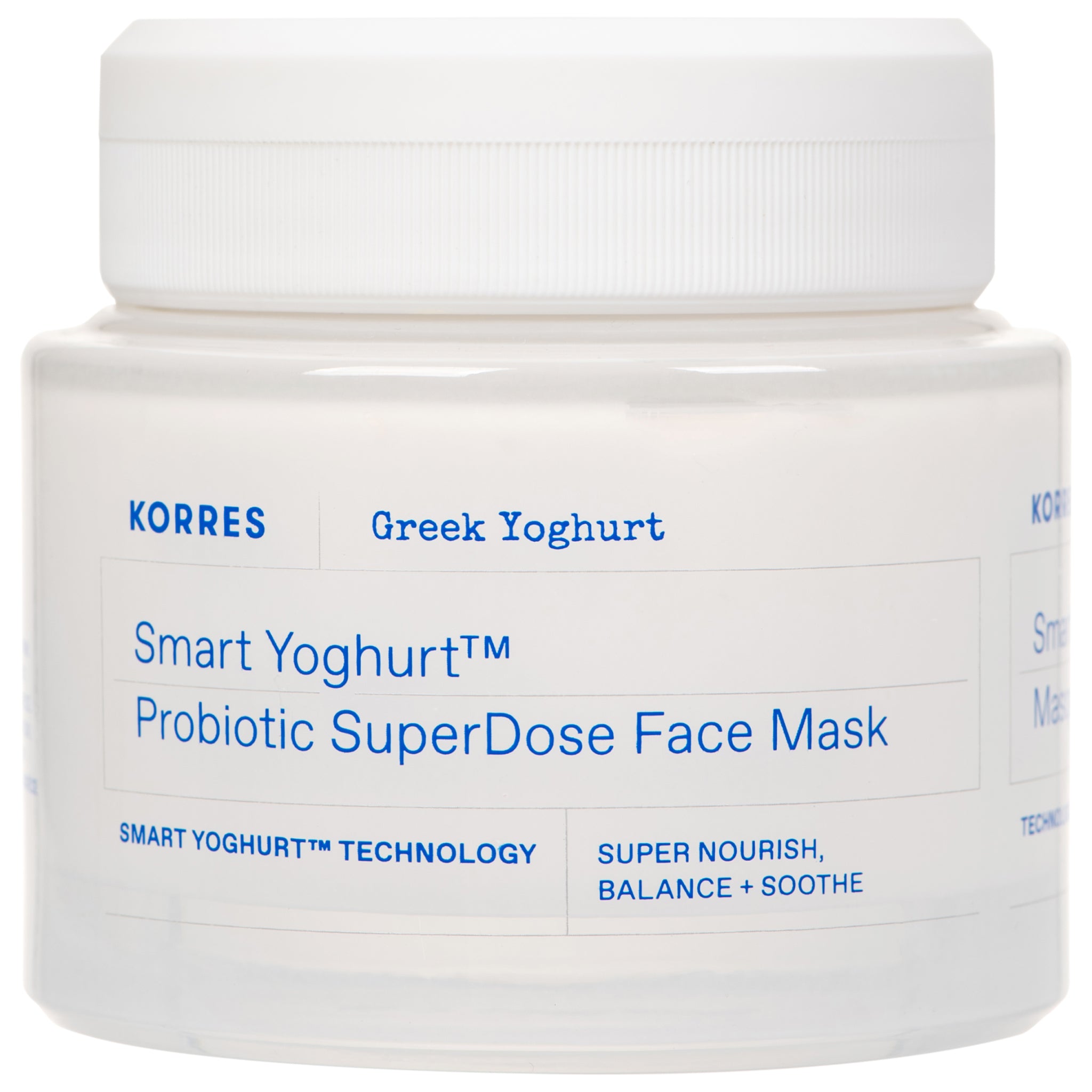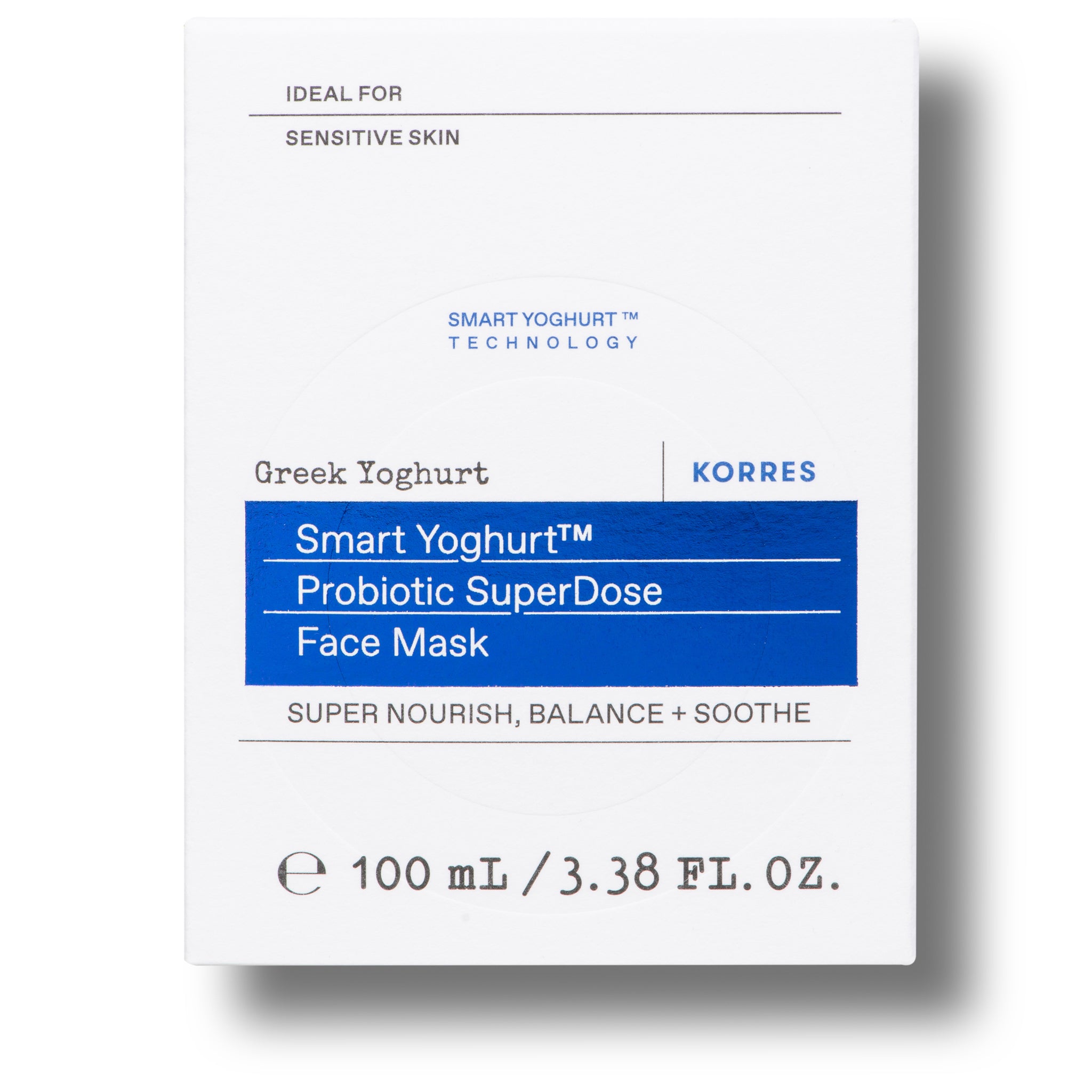 Het Smart Yoghurt Probiotic Superdose Face Mask van Korres is een rijke, romige behandeling die de huid in slechts 10 minuten een ware hydratatieboost geeft. Dankzij de unieke combinatie van Griekse yoghurt, probiotica en voedende oliën wordt de huid intens gevoed en voelt ze onmiddellijk zacht en soepel aan.