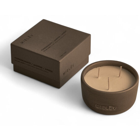 De Granaatappel, Jasmijn & Amber Geurkaars van Mielēv combineert fruitige, bloemige en warme geurnoten voor een unieke geurbeleving. Vervaardigd uit 100% sojawas en afgewerkt met drie lonten van biologische Griekse katoen, biedt deze kaars een gelijkmatige verbranding en een intense geurverspreiding. De handgemaakte keramieken houder is food-grade gecertificeerd, waardoor je hem na gebruik veilig kunt hergebruiken als stijlvolle opbergpot of kom. Met een brandtijd van circa 50 uur brengt deze kaars warmte, sfeer en luxe in elk interieur.